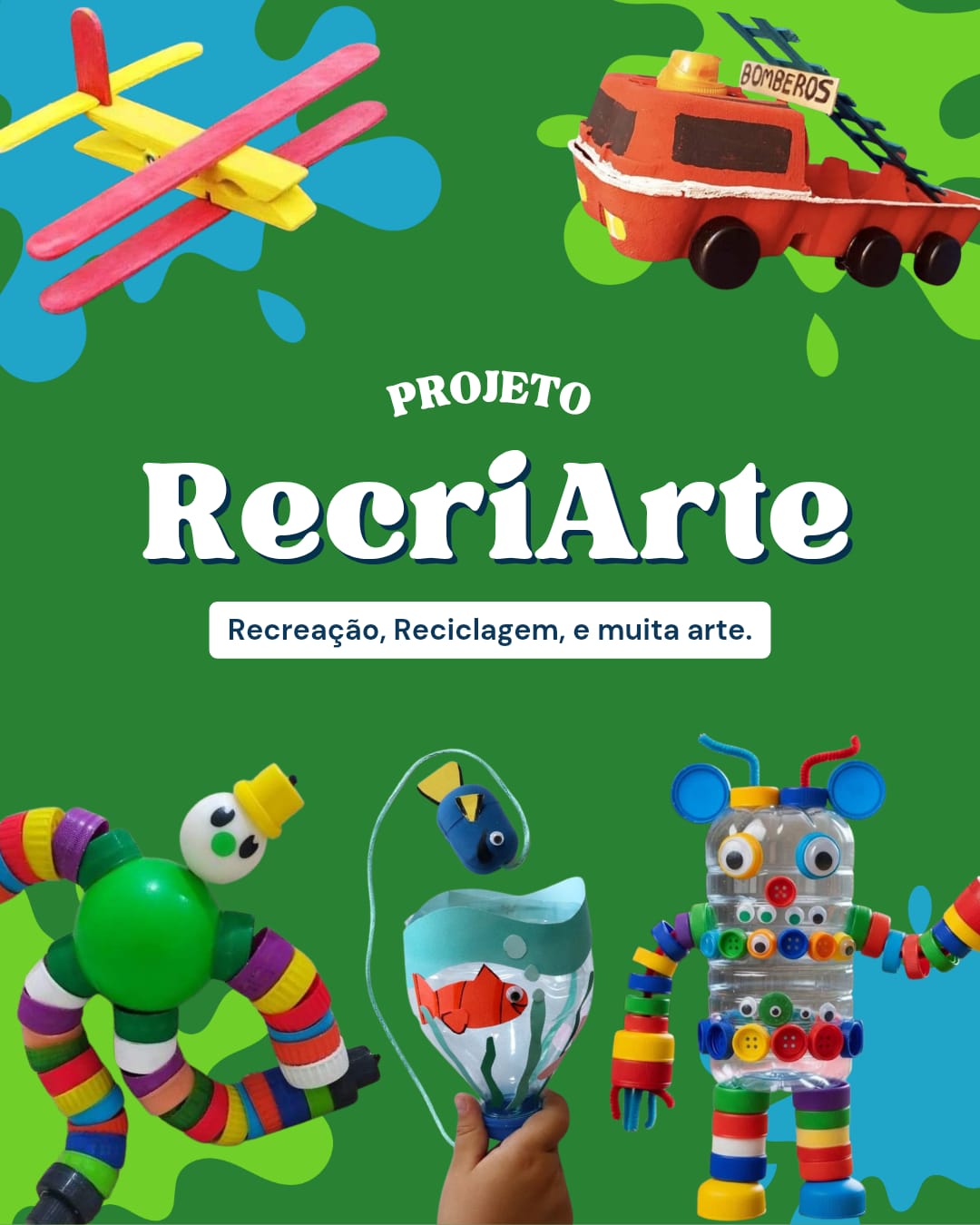 O RecriArte é uma intervenção artístico-educativa que convida crianças e adultos a transformarem materiais recicláveis em brinquedos e objetos criativos. A partir do uso de itens como garrafas, tampinhas, embalagens e papéis, a proposta cria um espaço de experimentação, imaginação e expressão.